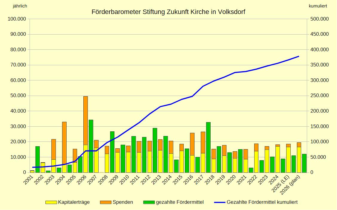 Die Stiftung erweitert die Förderung auf 24.00 Euro pro Jahr für 2* Viertel Stelle Jugenddiakon (Zahlung jeweils Anfang des Folgejahres). Ein Spender sichert die Deckung von Lücken zu, sollten die Erträge der Stiftung nicht ausreichen.